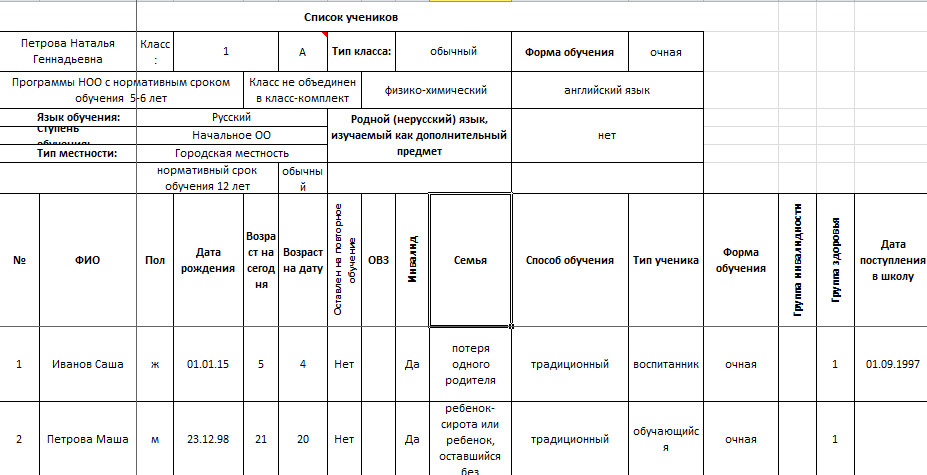 Этот анализатор позволяет вести учет всех основных сведений об учениках класса и их родителей: