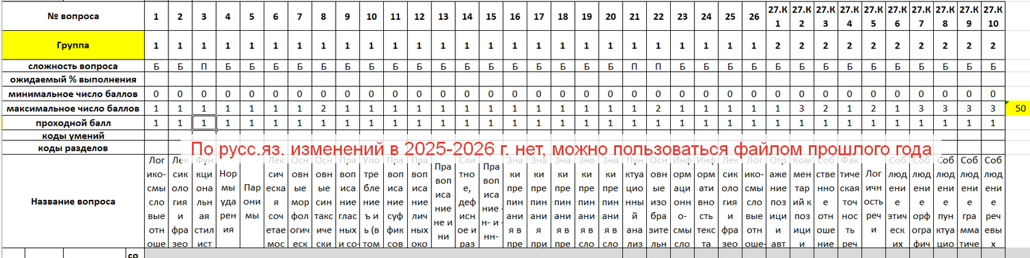 - Изменений в структуре экзамена по русскому языку в 2026 г. по сравнению с 2025 годом нет, поэтому вы можете пользоваться таблицей, купленной в прошлом году.
