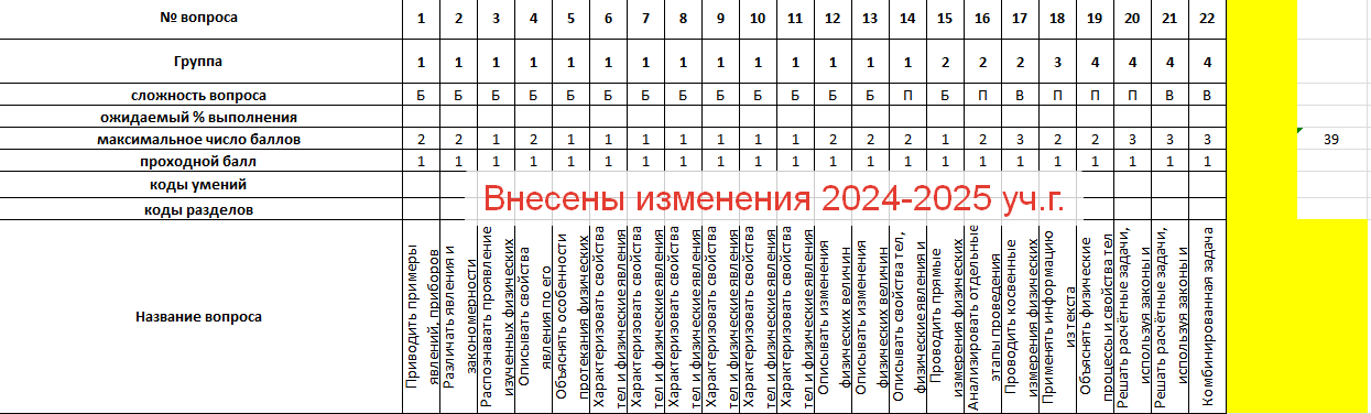 - Внесены изменения в шаблон 2025 г.: сокращено число заданий с 25 до 22, изменен максимальный первичный балл с 45 до 39 б., внесены изменения в наименование вопросов. Подробнее см. на скриншоте.